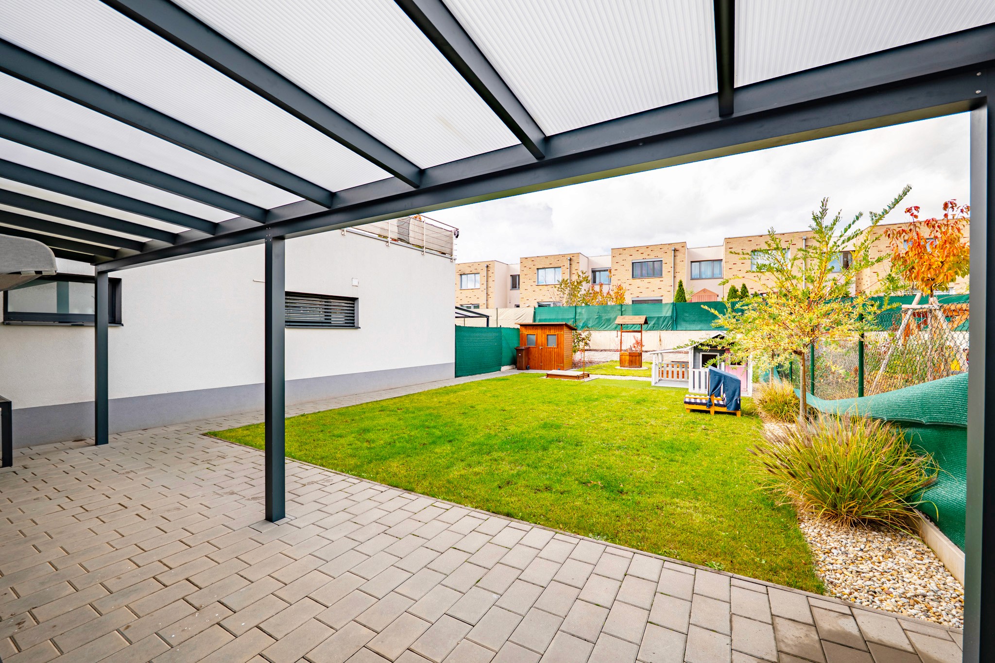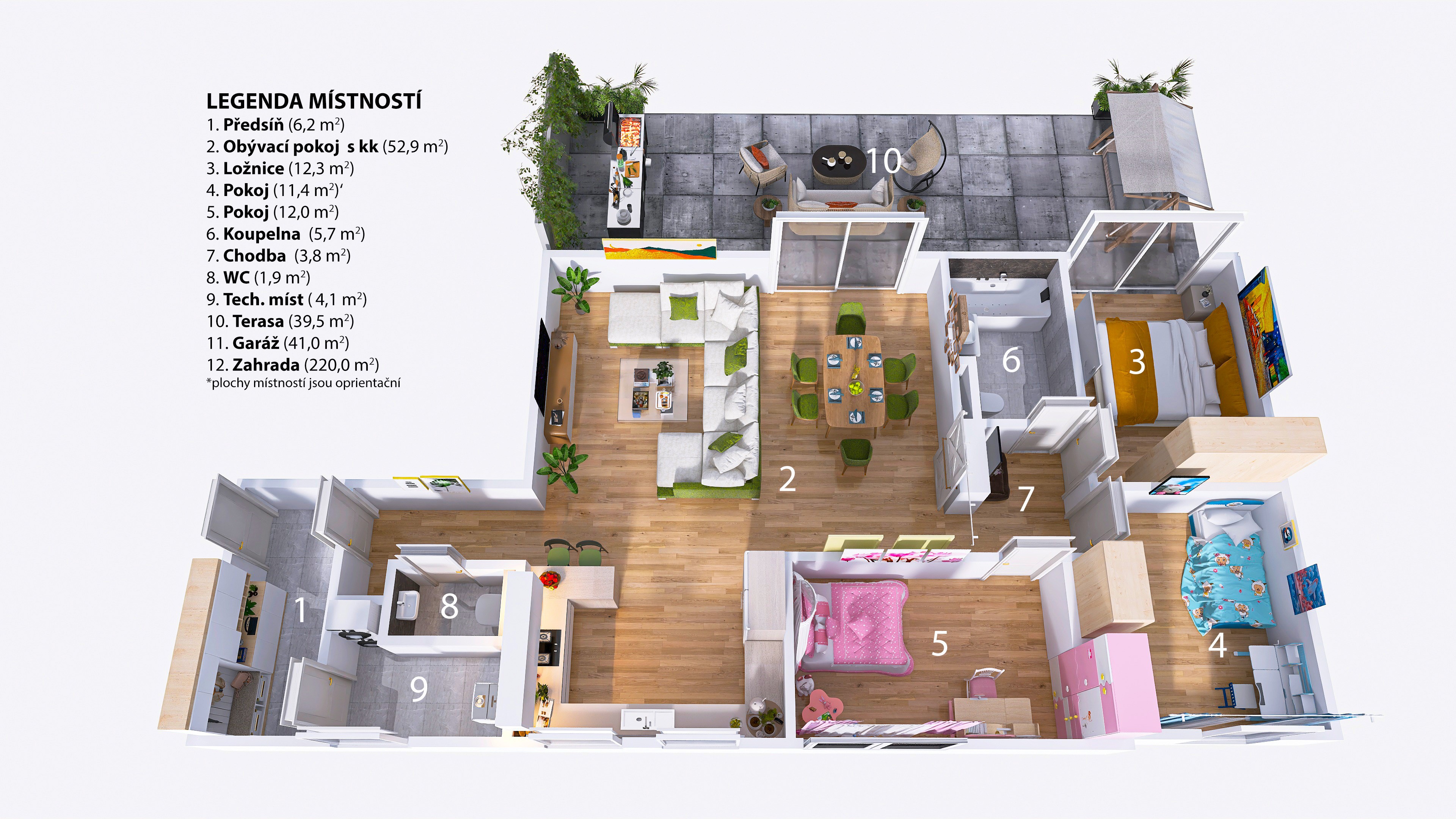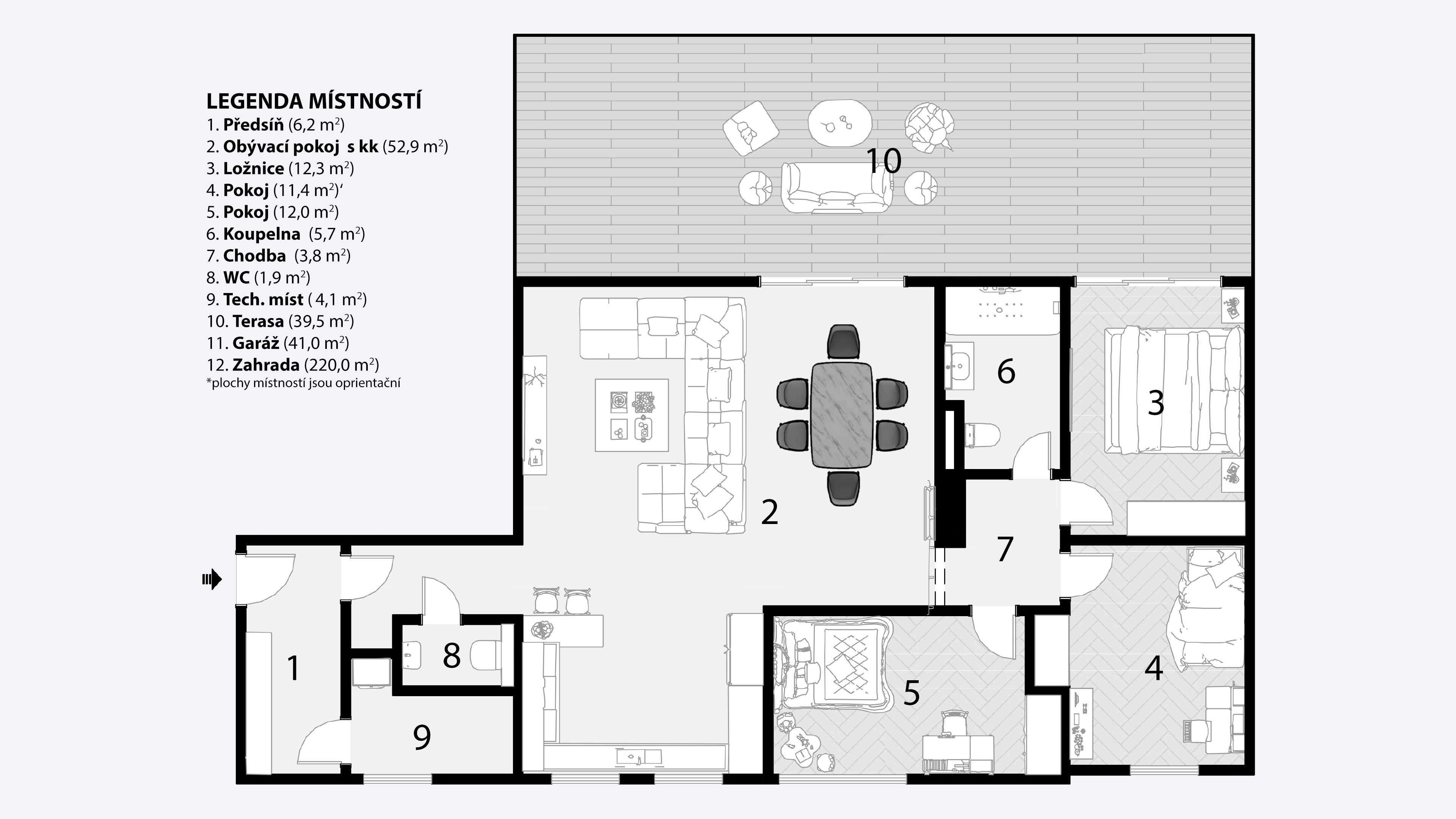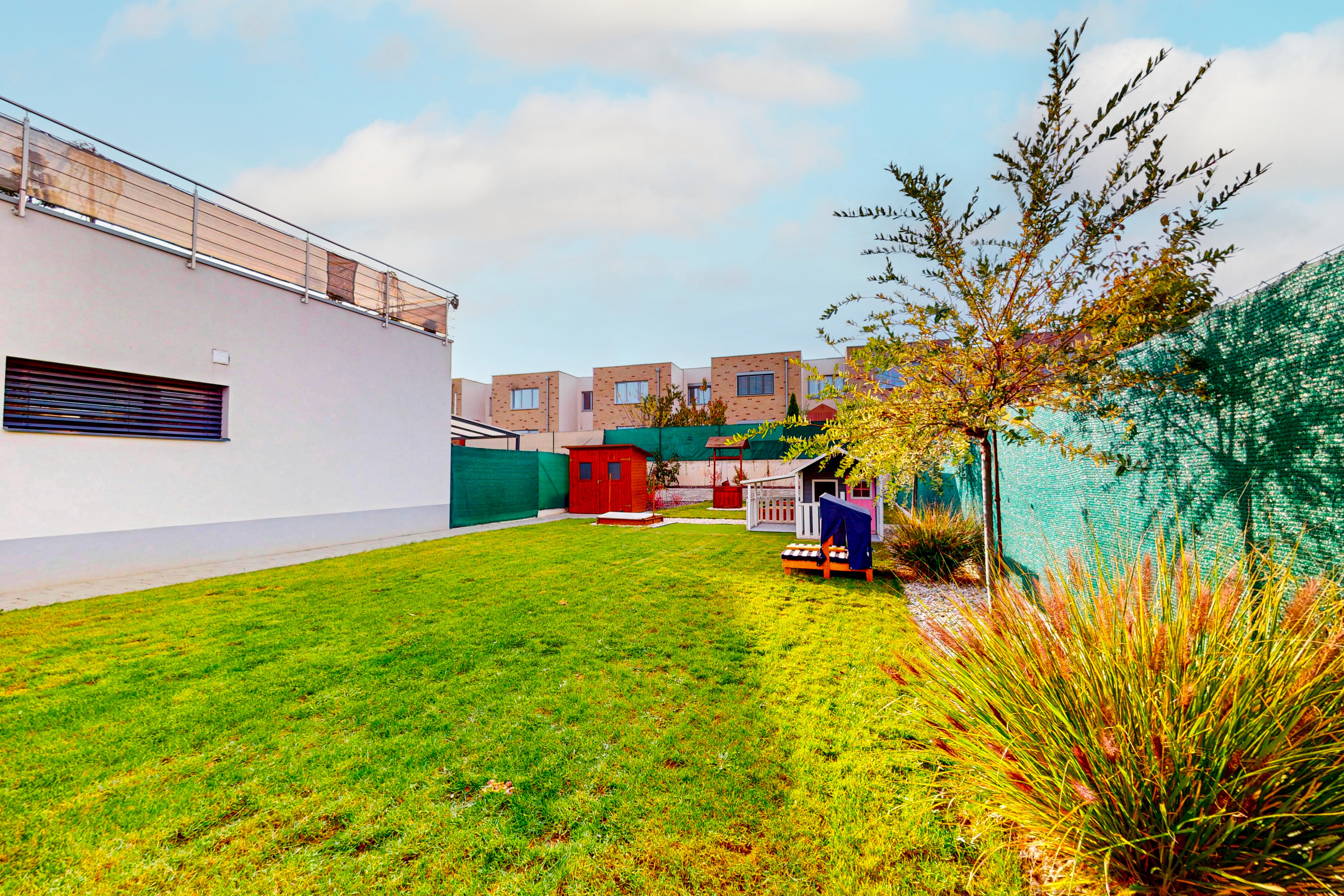 • Velkorysý obývací prostor propojený s terasou a soukromou zahradou (220 m²) – vaší oázou klidu, kde rána začínají světlem zeleně a večery voní po grilování a sdílených chvílích.